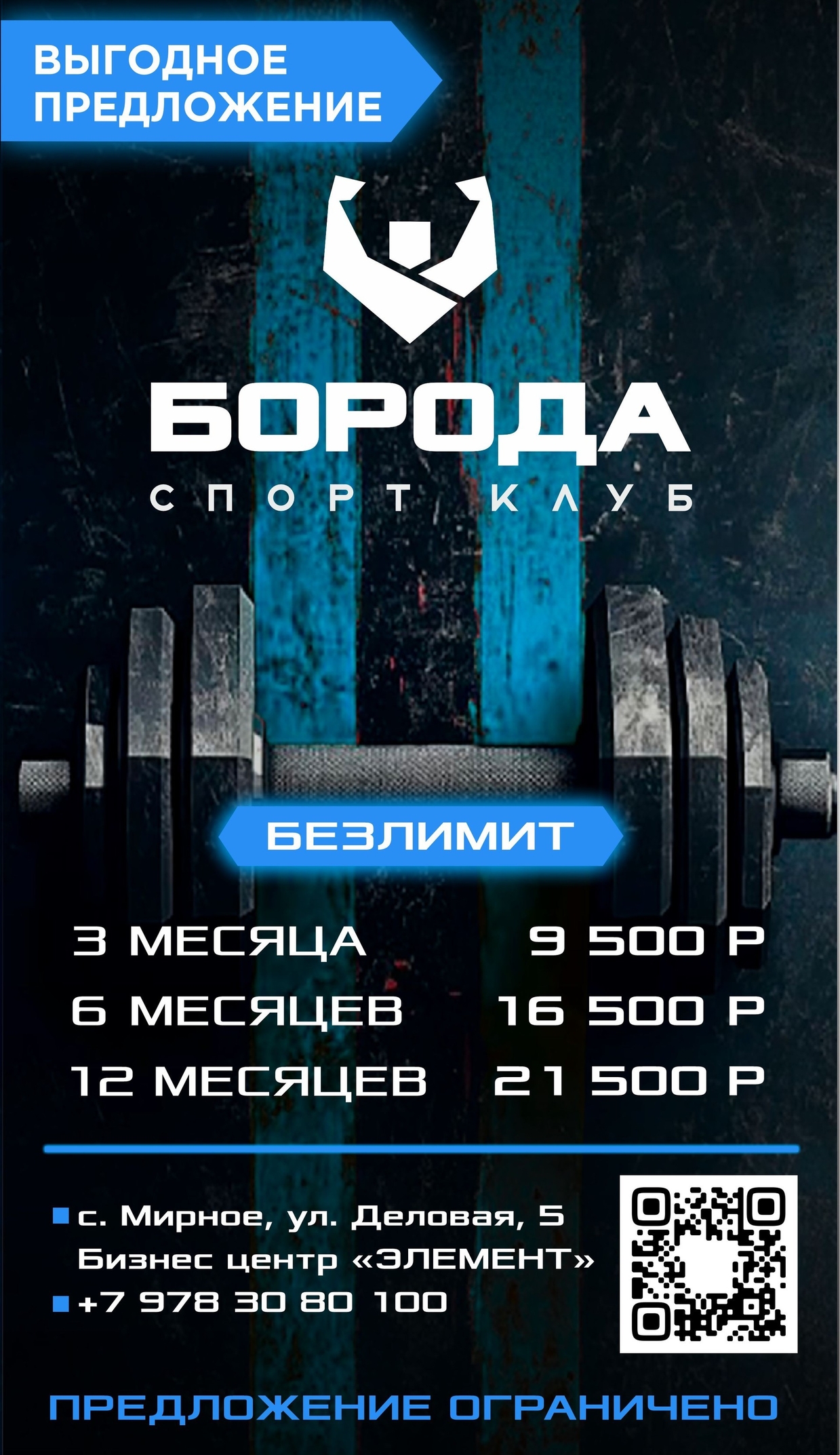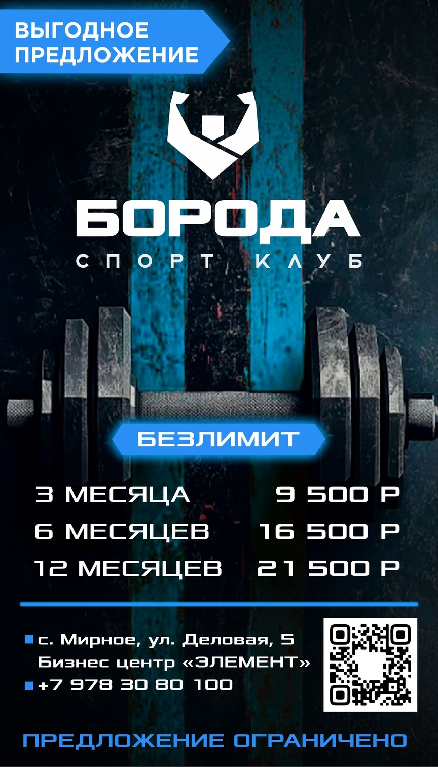 🔥 ВЫГОДНОЕ ПРЕДЛОЖЕНИЕ от спортклуба «Борода»! 🔥 Хочешь начать заниматься, но ждёшь знак? Вот он 💪 Только сейчас — безлимитный абонемент по суперцене: 🏋️♂️ 3 месяца — 9 500 ₽ 🏋️♂️ 6 месяцев — 16 500 ₽ 🏋️♂️ 12 месяцев — 21 500 ₽ Тренируйся без ограничений, укрепляй тело и дух, достигай своих целей с нашей командой! 📍 с. Мирное, ул. Деловая, 5, Бизнес-центр «ЭЛЕМЕНТ» Поторопись! Количество абонементов ограничено.